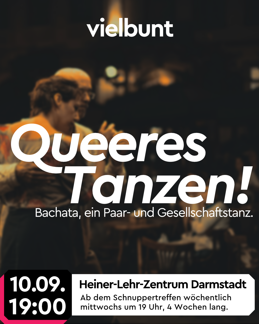 Nach Salsa widmen wir uns in unserer Latino-Tanz-Reihe nun dem Bachata, einem beliebten Paar- und Gesellschaftstanz, der seine Wurzeln in der Dominikanischen Republik hat. Hast du Lust bekommen, dich uns anzuschließen? Dann komm zum queeren Bachata-Tanzkurs von vielbunt Sport!