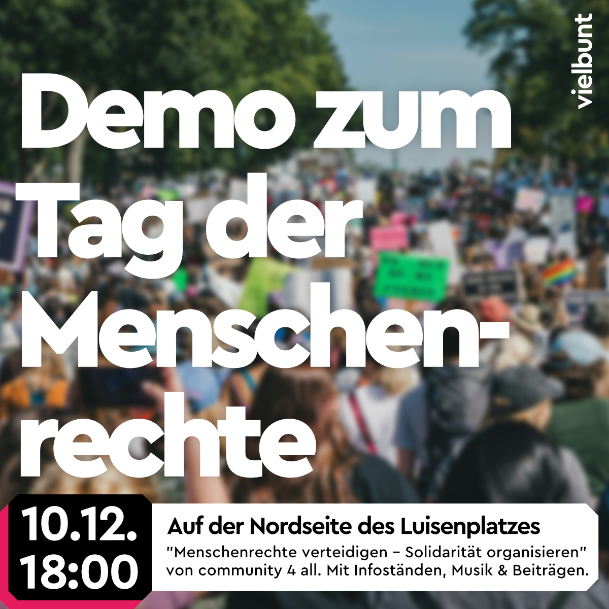 Gemeinsam zur Demo von community 4 all zum Tag der Menschenrechte! Die Demo steht unter dem Motto „Menschenrechte verteidigen – Solidarität organisieren“ und wird am Dienstag, den 10. Dezember, ab 18:00 Uhr auf dem Luisenplatz stattfinden.