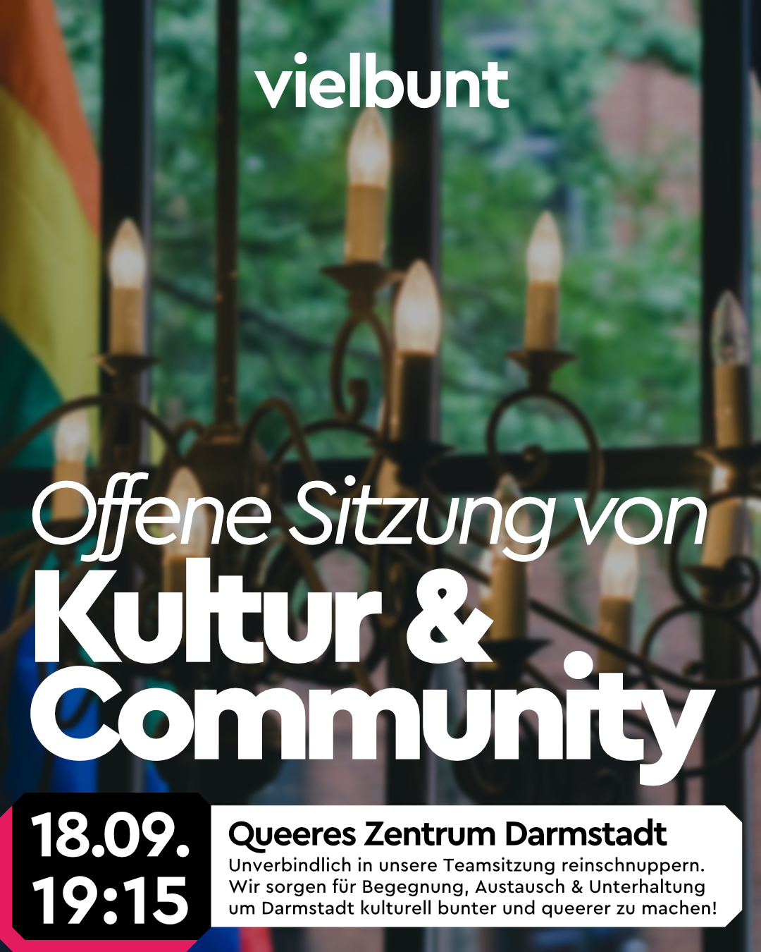 Wir führen beispielsweise den monatlichen Stammtisch „Treffbunt“ durch, den Kunsttreff Queeriosity, das Pubquiz oder den Queerslam durch. Melde dich bei Fragen einfach bei kulturundcommunity@vielbunt.org