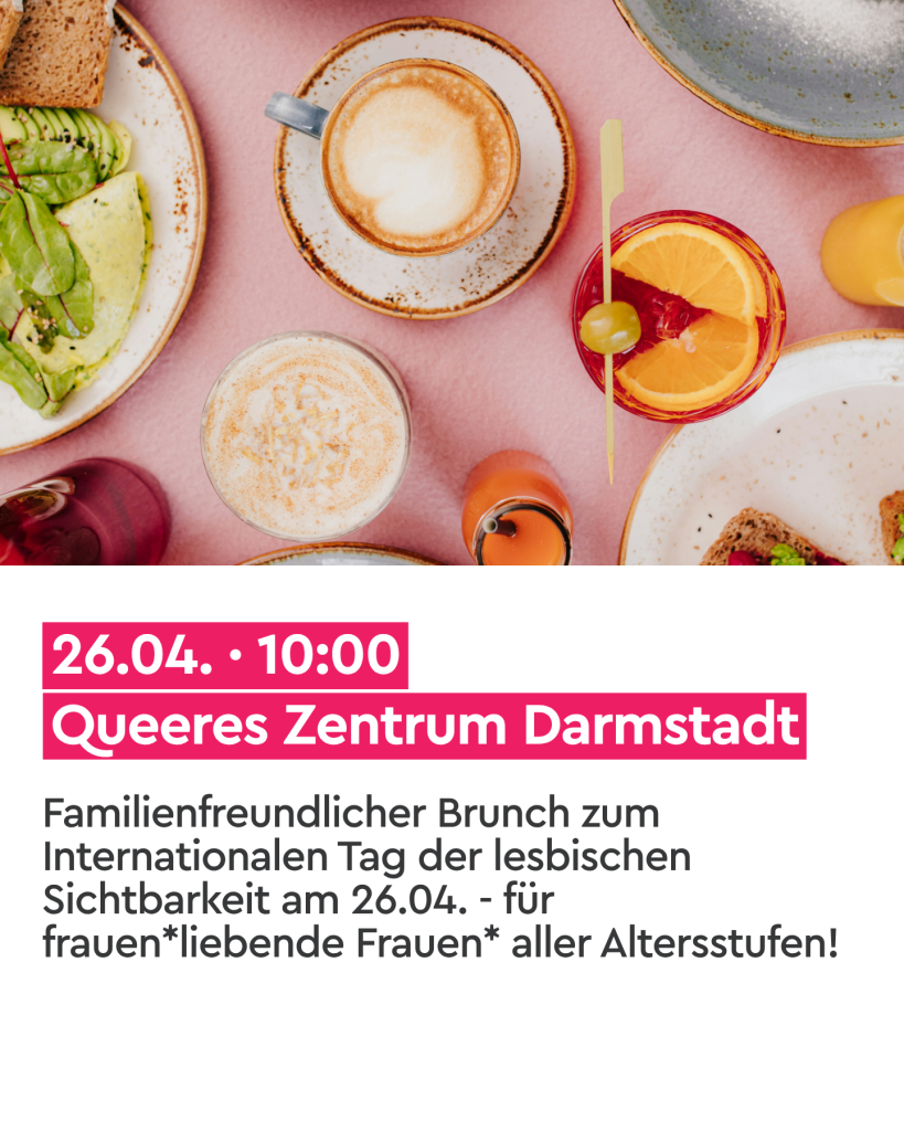 Seit 2008 wird jedes Jahr am 26. April weltweit der Lesbian Visibility Day gefeiert. In diesem Jahr auch bei vielbunt: Am Sonntag, den 26.04.2026, laden wir frauen*liebende Frauen* aller Altersstufen von 10 bis 14 Uhr zu einem gemütlichen Brunch im Queeren Zentrum (Kranichsteiner Straße 81, 64289 Darmstadt) ein. Egal ob Einzelperson, Paar, Polykül oder Familie mit Kindern – werdet sichtbar füreinander! Wir freuen uns auf viele tolle Begegnungen. Es wird ein buntes Buffet mit vegetarischen und veganen Optionen geben. Der Eintritt ist frei. Bitte meldet euch bis zum 24.04. über folgenden Link an: https://forms.gle/hygPMafXtZc3ci877