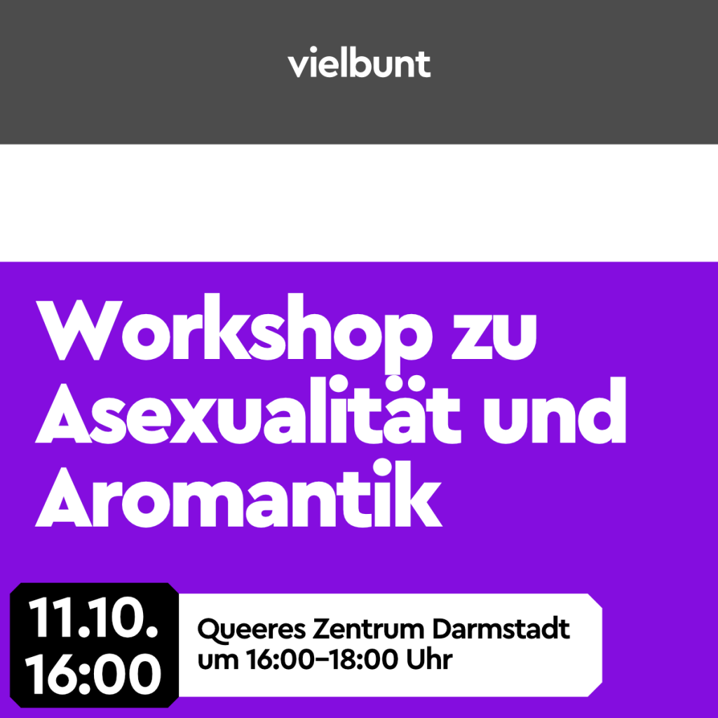 Am 11. Oktober 16 Uhr bis 18 Uhr findet ein Workshop zu A*Themen bei vielbunt im Queeren Zentrum Darmstadt statt.